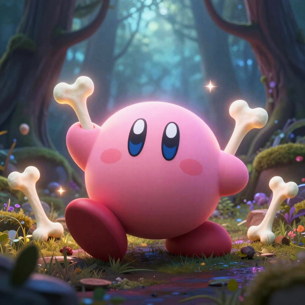 A cute Kirby skeleton exploring an ancient haunted castle, flickering candlelight casting shadows on skeletal form, soft pastel colors infused with dark gothic tones, detailed background with cobwebs and old stone walls
