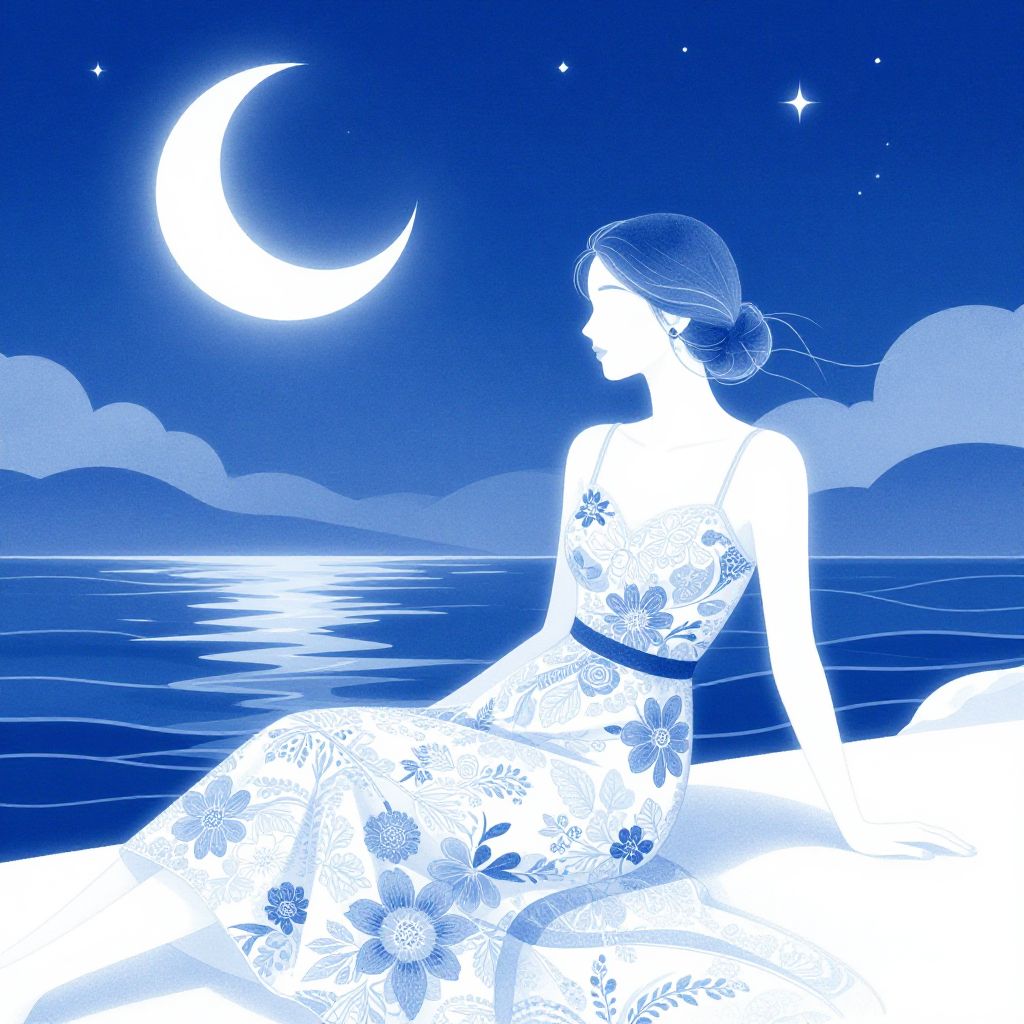 An elegant woman in a detailed floral dress sits by the water under a crescent moon and starry night sky. The stylized artwork uses a blue and white color palette with flowing lines to create a serene and dreamy atmosphere, blending natural elements with a sophisticated, illustrative style.