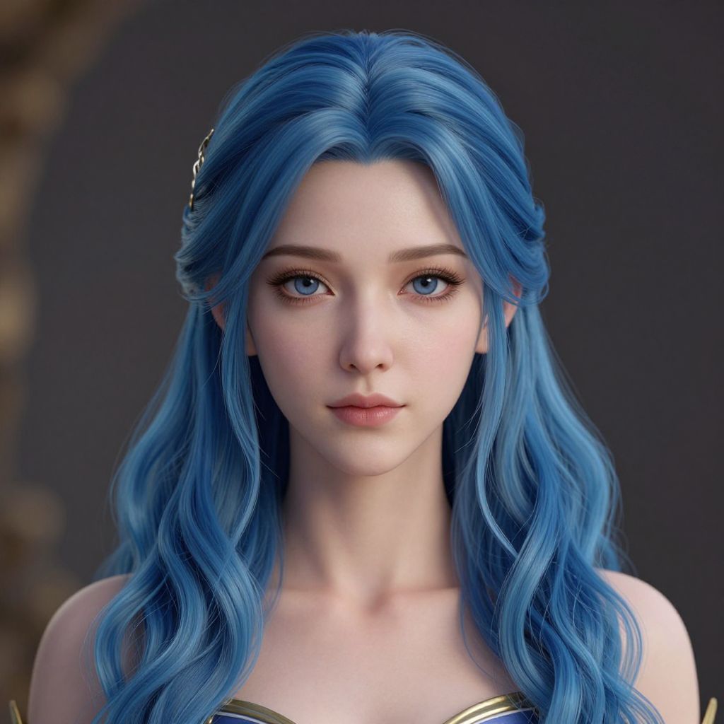 Centered detailed portrait of an attractive young woman, long blue wavy hair, slender symmetrical face, fantasy, details, intricate, octane render, smooth, illustr
