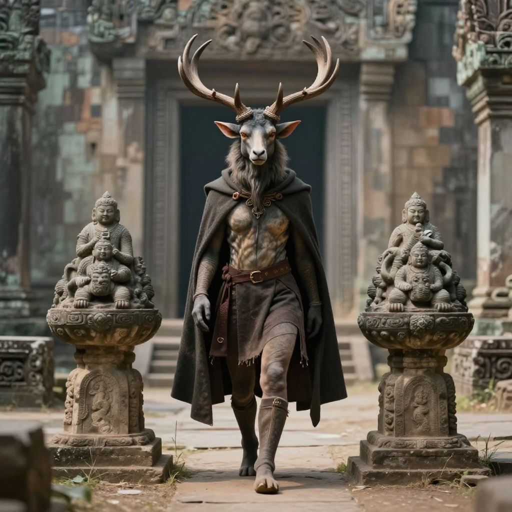Masterpiece, best quality, keeper-of-balance walking through a ancient ruins, solo, pointy ears, cape, antlers, horns, looking at viewer, realistic, depth of field, blurry background