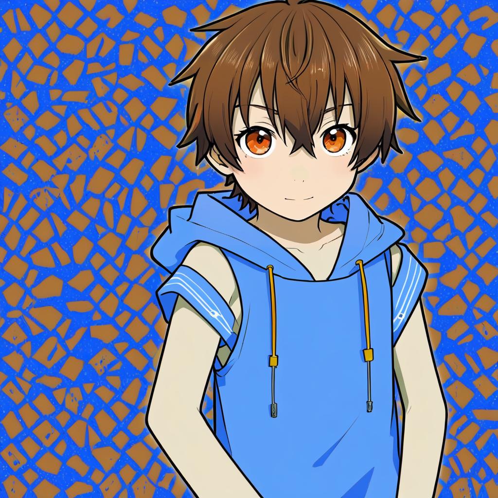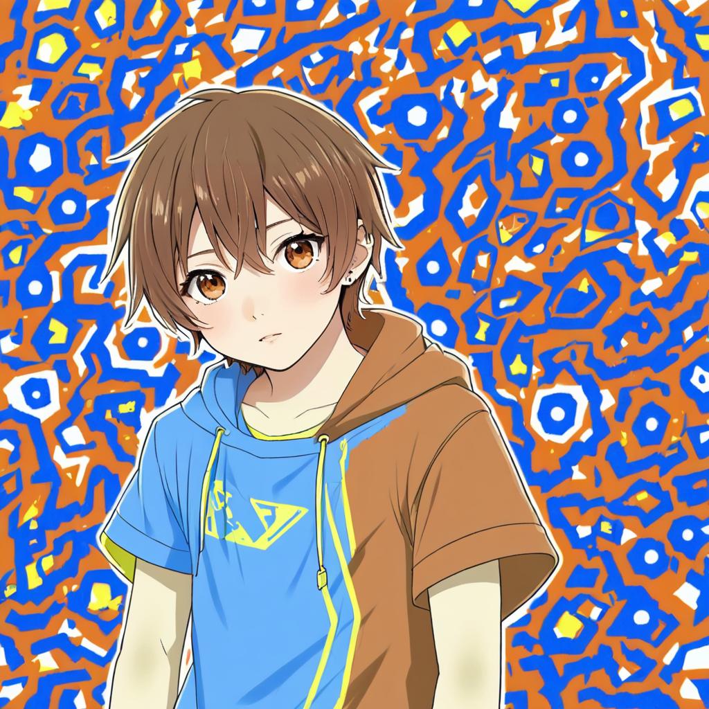 Digital anime style illustration of a young boy with short brown hair and brown eyes wearing a blue T-shirt and a brown sleeveless hoodie with the hood down. The character stands against a vibrant, abstract patterned background in orange, blue, white, and yellow. The artwork features detailed facial shading, soft blush on the cheeks, and multiple ear piercings, highlighting a modern anime aesthetic.