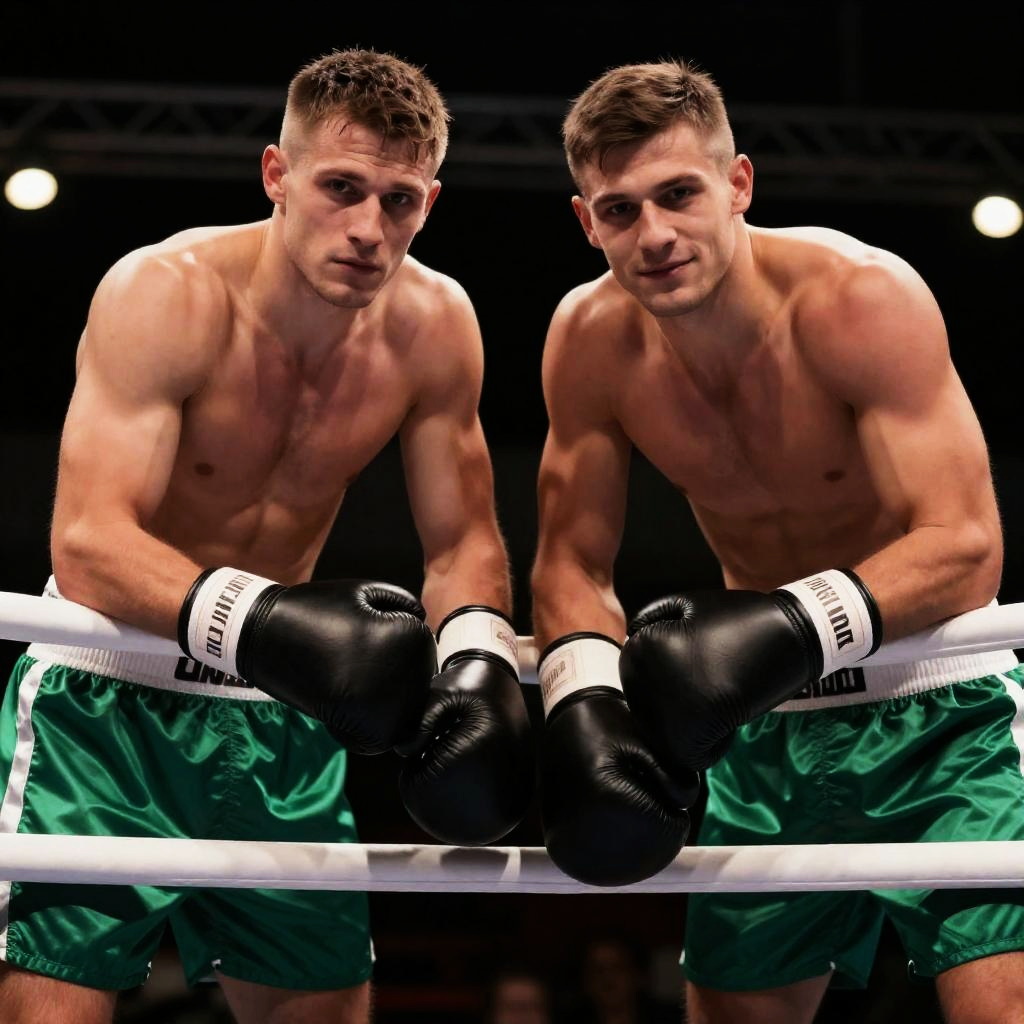 Muscular, shirtless man with short brown hair stands in black boxing shorts with red and white designs. Two men sit on wooden floor, one in white shirt, one in gray. Wooden pergola, green trees, blue sky in background. Boxers' shorts have "World" . Man stands confidently, others look down.
