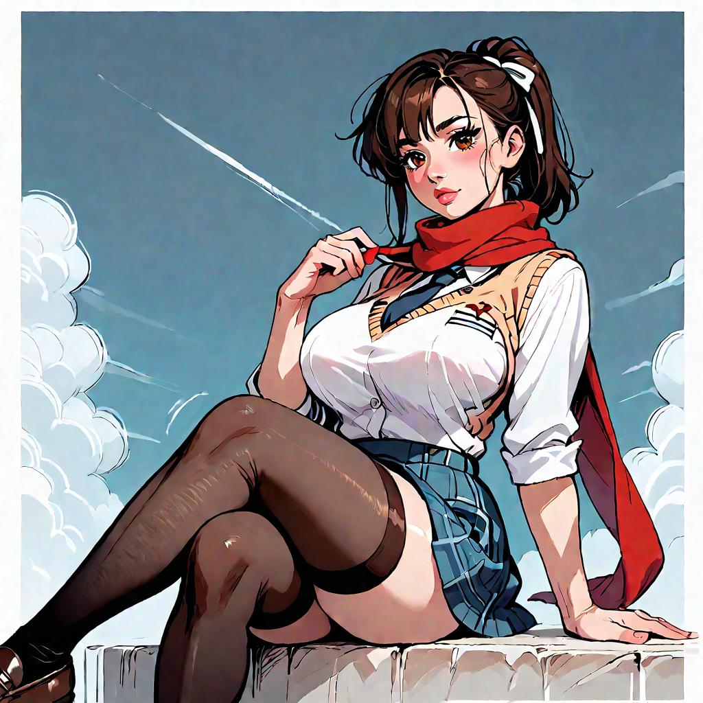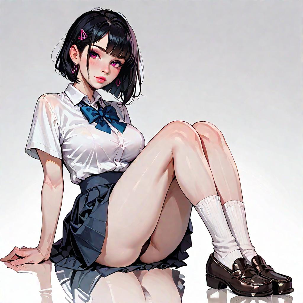 Score_9, score_8_up, score_7_up, 1girl, solo, 19-years-old, pretty face, posing naughty, school uniform, large breasts, beautiful legs, slender, silky skin, short skirt, white socks, black loafers, source_anime
