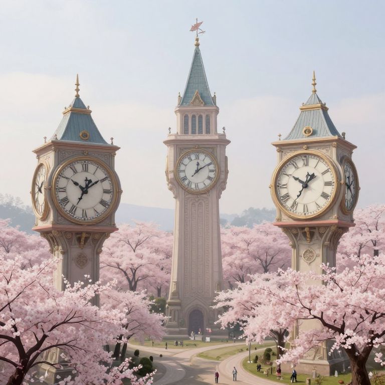 This is a digital illustration depicting a picturesque scene featuring three ornate clock towers with green, pointed roofs and large, white clock faces with black Roman numerals. The central tower is taller and more slender, while the two side towers are square. The background is filled with pink cherry blossom trees in full bloom, creating a soft, pastel atmosphere. A winding path leads through the cherry blossoms, with tiny, dark silhouettes of people walking. The sky is clear and blue, enhancing the vibrant colors of the blossoms and the towers. The overall style is whimsical and romantic, evoking a serene, springtime setting.