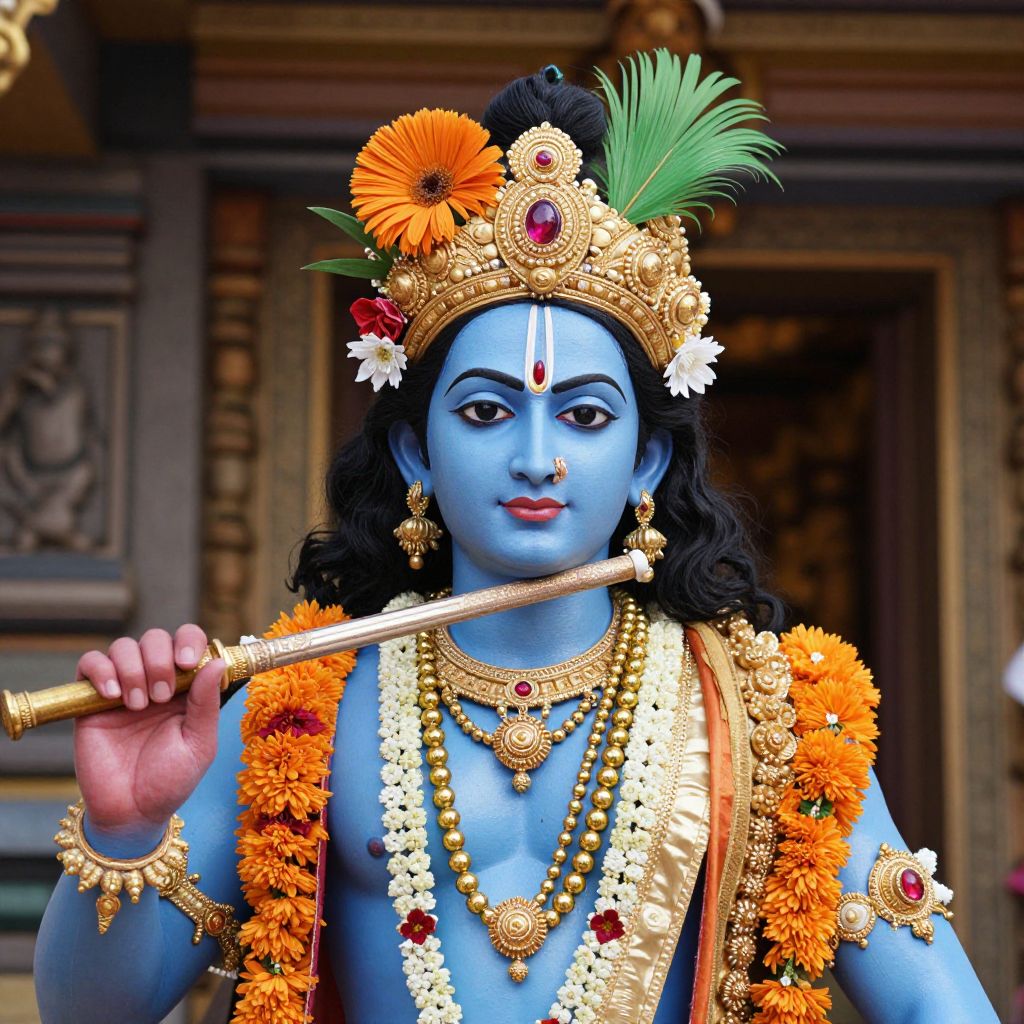 God Krishna Male Costume, a close up of a statue of a man in a temple