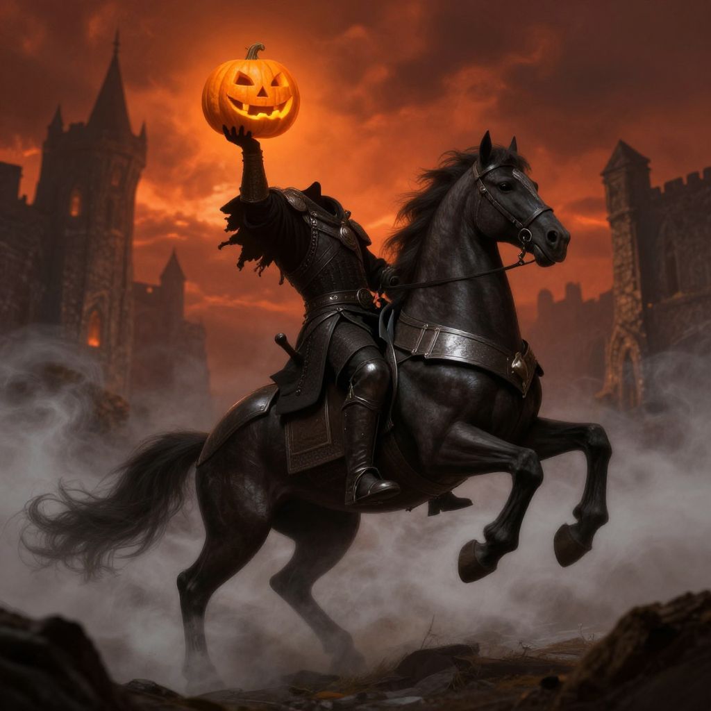 How to draw headless horseman emerging from fog in a spooky graveyard scene, capturing dynamic composition, intricate armor details on the rider, fiery aura where the head should be, spectral horse with wispy mane, tombstones in background, dramatic chiaroscuro lighting, dark fantasy art.