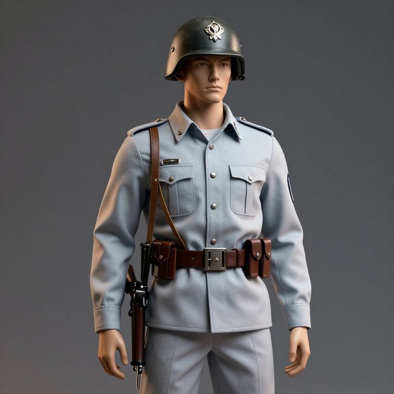 A detailed mannequin standing confidently in a military-style uniform, complete with a crisp jacket, trousers, and a leather belt, wearing a realistic helmet and a polished military hat; a fully functional rifle is holstered on its side, adding a dramatic and stylized touch; the mannequin has a neutral, expressive face with a subtle hint of a soldier's resolve, rendered in high detail with realistic fabric textures, metallic reflections, and ambient lighting to emphasize the futuristic and slightly surreal atmosphere of the scene.