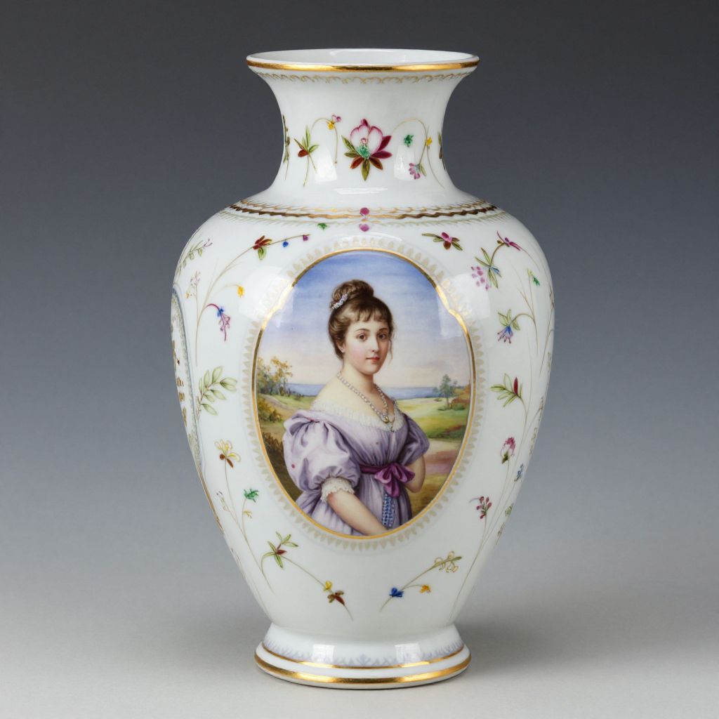 Photograph of an ornate porcelain vase with a painted portrait of a Victorian woman in a lavender dress, surrounded by floral motifs.