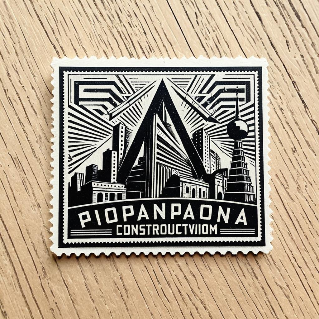 Russian constructivism rubber stamp, with an image of propaganda poster and bold geometric shapes.