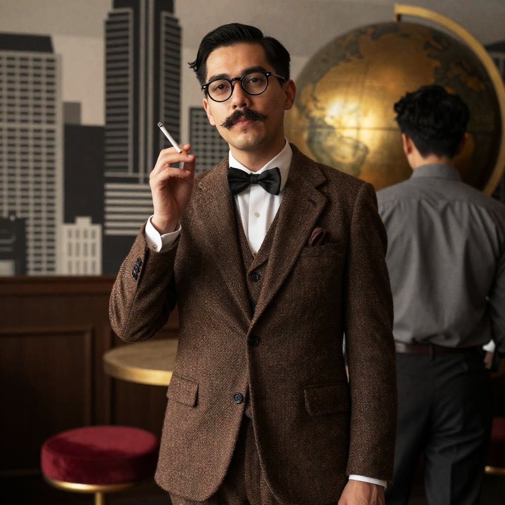 Man in brown tweed suit with bow tie, glasses, and mustache, holding cigarette, standing in vintage-style room. Background: black-and-white cityscape mural, large gold globe, another man in gray shirt facing away. Red cushioned stool in foreground.