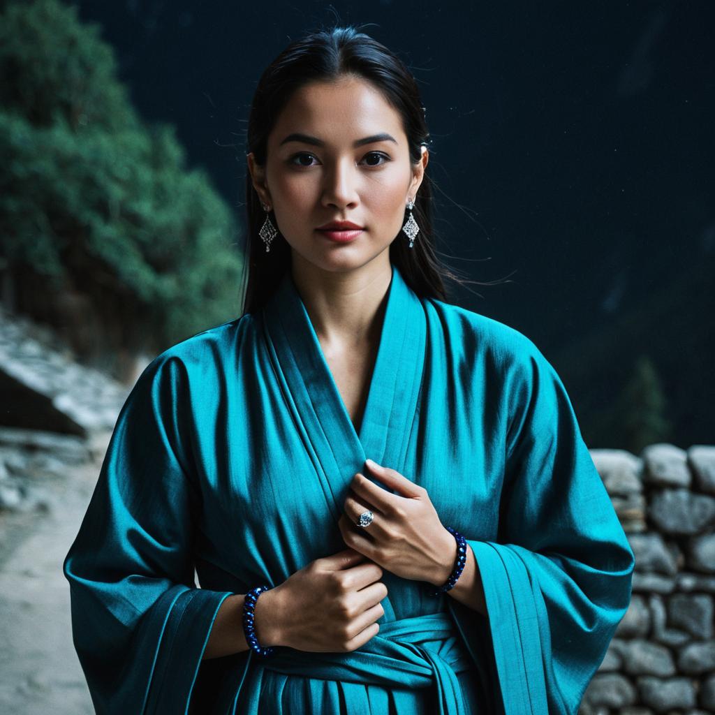 Portrait of a slim Asian woman wearing a deep sapphire blue silk monk robe with a brown braided belt. She has clear, distinctive facial features and long, natural shiny black hair styled simply. She accessorizes with sparkling diamond earrings and a turquoise ring. The background features a dark mountainous night setting with faintly lit structures, suggesting a mystical Himalayan location.
