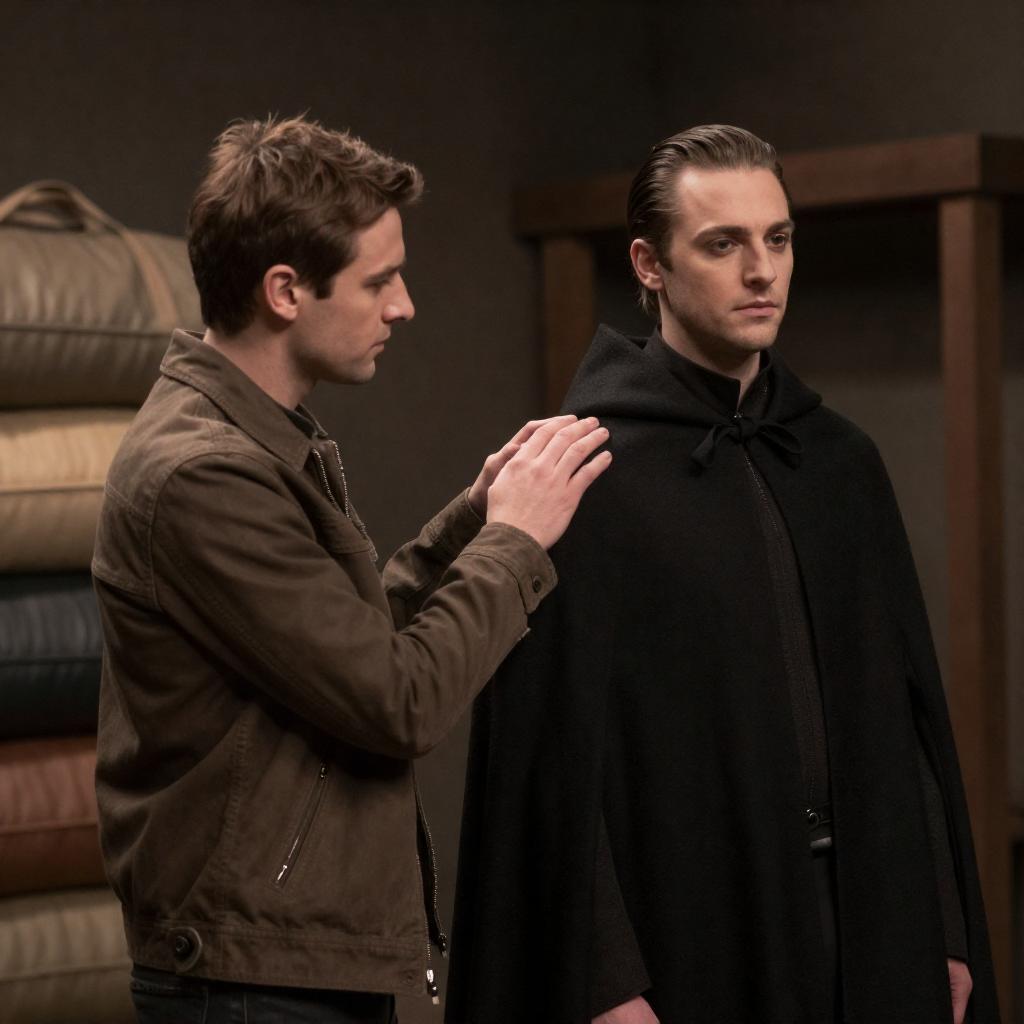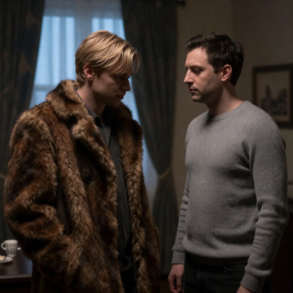 Photograph of two men in a dimly lit room. The man on the left has blonde hair, wears a brown fur coat, and looks down. The man on the right has dark hair, wears a gray knit sweater, and looks at the blonde-haired man. A window with patterned curtains is in the background, casting blue light.