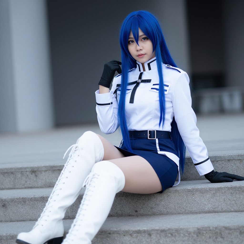 Asian female cosplayer dressed as Esdeath, a character with long blue hair, wearing a white military-style jacket with black accents, navy blue skirt, black gloves, and thigh-high white lace-up boots. She is sitting on concrete steps against a gray urban background, creating a striking contrast with her vibrant costume. The photo features a shallow depth of field highlighting the subject.