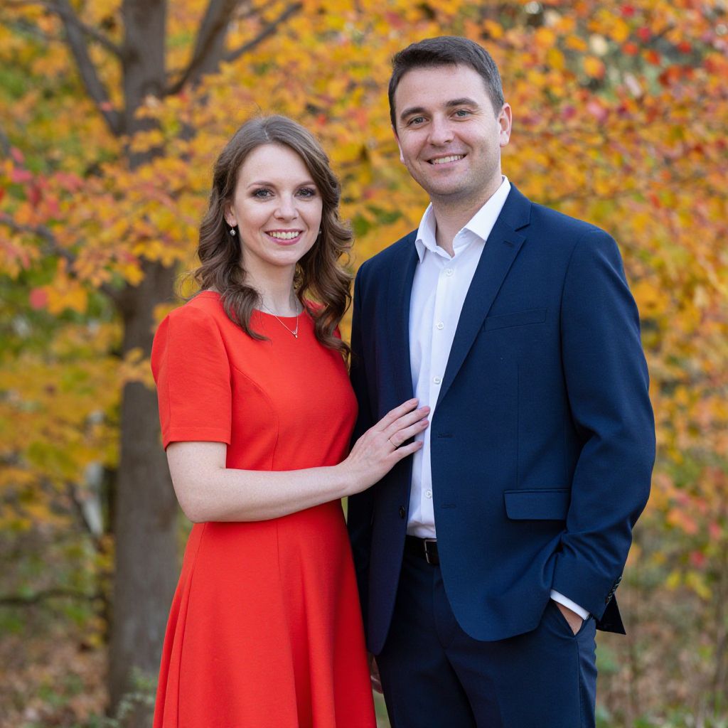 Photograph of a smiling Caucasian couple in autumn; woman in bright red dress, man in black suit and white shirt, standing close together. Background features