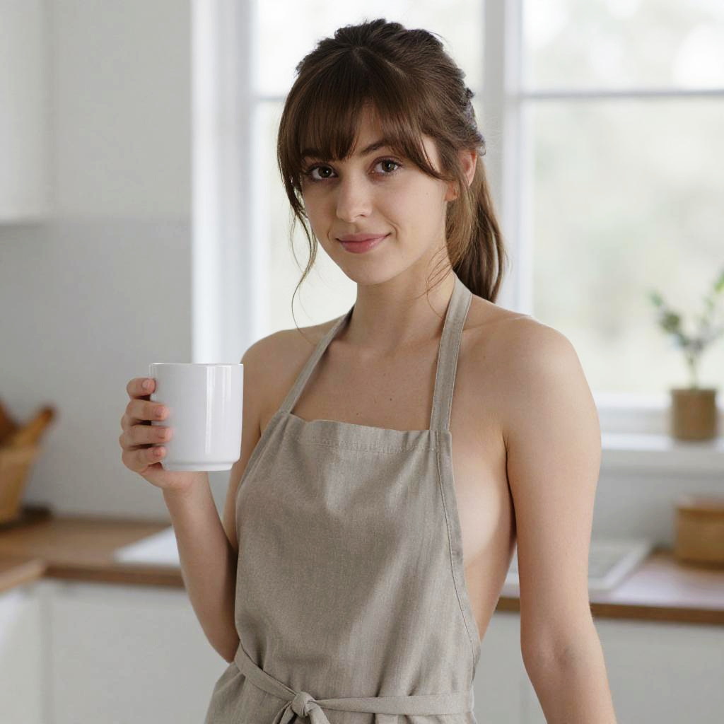 (photorealistic:1.4), (8k, RAW photo:1.2) 1girl, solo, breasts, looking at viewer, smile, bangs, skirt, brown hair, holding, cleavage, medium breasts, standing, indoors, medium hair, mole, blurry, window, blurry background, holding cup, realistic, kitchen, photo background, naked apronponytail or long hair