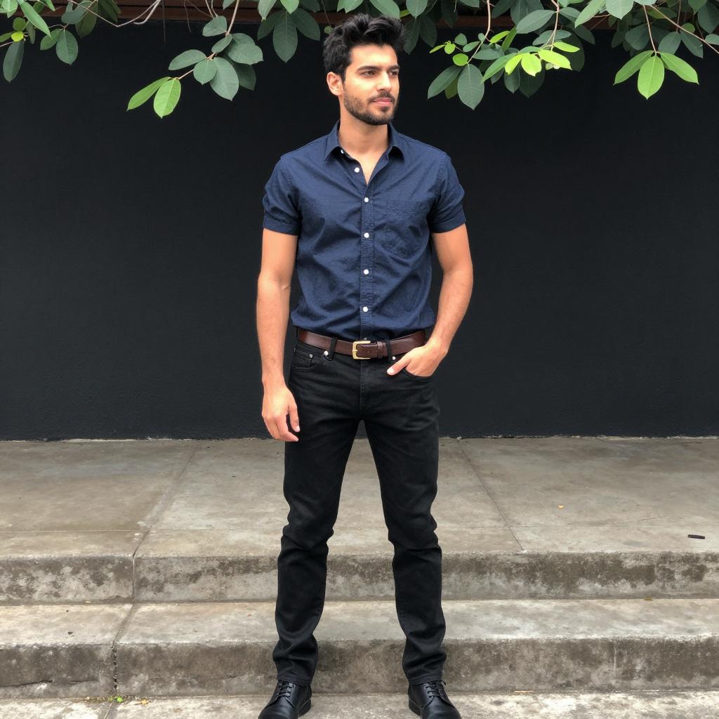 Young man with short dark hair and slight beard wearing a dark blue short-sleeve button-up shirt paired with black jeans, a brown belt with a gold buckle, and black shoes. He stands confidently on concrete steps with one hand in his pocket against a dark wall background with green leafy branches overhead, in natural daylight.