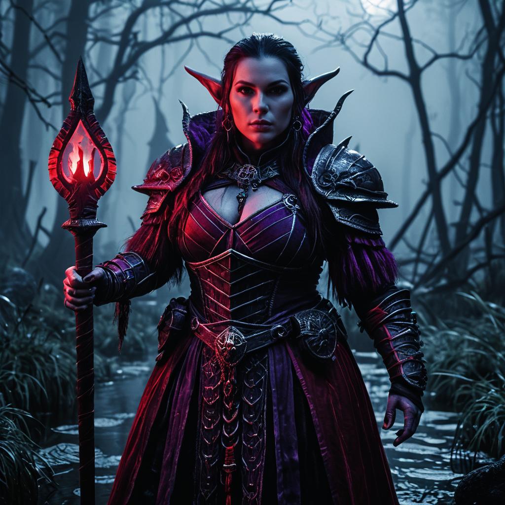 Fashion movie-style scene of Sylvanas Windrunner from World of Warcraft, a fierce elven warrior, wearing a ornate midnight-blue leather corset dress with silver embroidery. Styled with exaggerated features and cinematic lighting, evoking a Balenciaga commercial aesthetic.