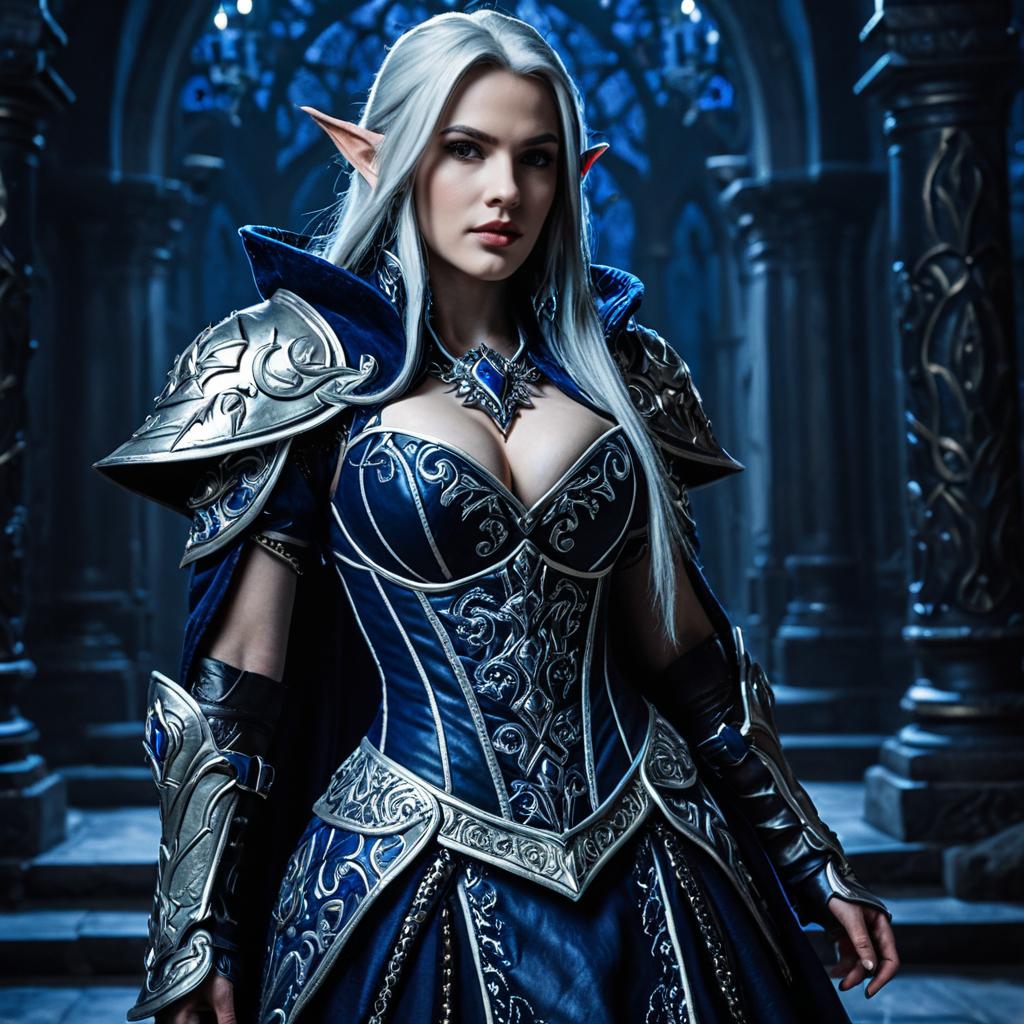 Portrait of a fierce female elven warrior dressed in an ornate midnight-blue leather corset dress with intricate silver embroidery and matching silver armor pieces. She has long silver hair, pointed elf ears, and wears a dramatic high-collared cloak. The background features a dark, gothic cathedral-like setting with cinematic lighting.