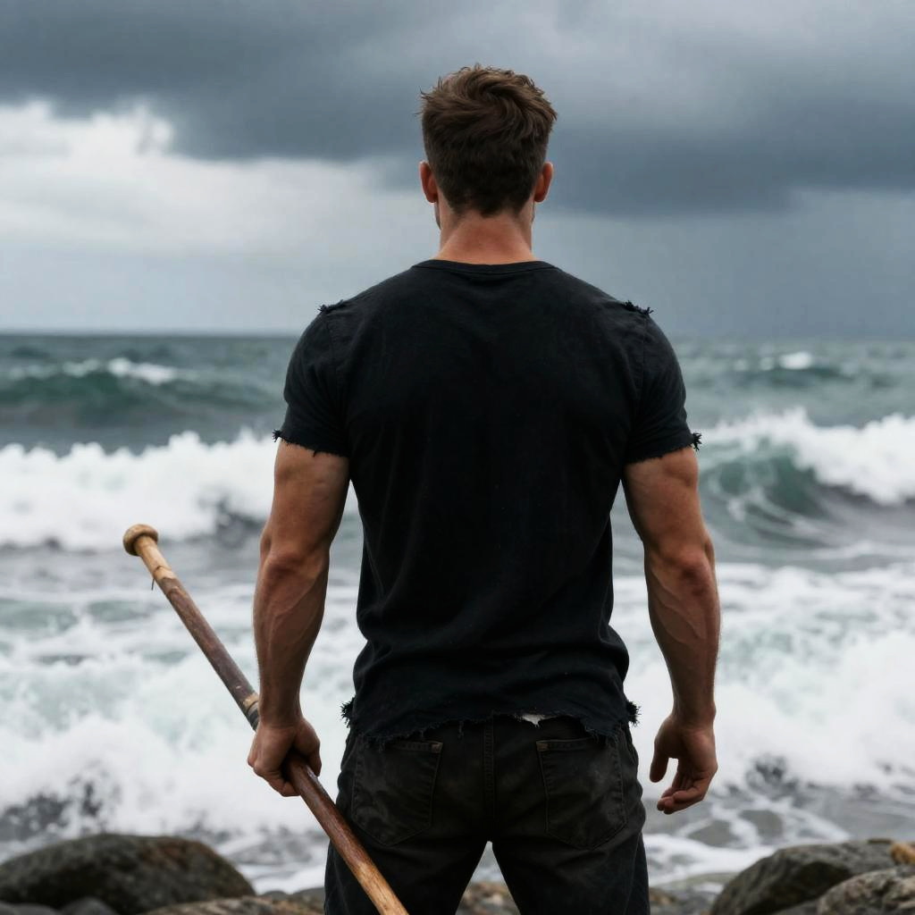 Shirtless man with short dark hair and medium build walks up a steep, asphalt road towards the camera. He wears dark pants. American flag on building to the left. Old gray car in the foreground. Overcast sky. Building with black metal railing and brick walls.