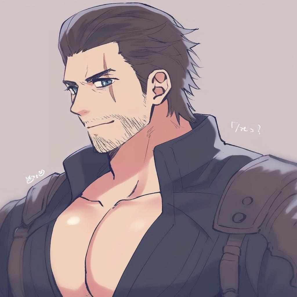 Adventurer (ff14), final fantasy, 1boy, mature male, beard stubble, mustache stubble, blue eyes, thick eyebrows, scar across eye, short hair, brown hair, black hair, medium hair, hair slicked back, hyur, stubble, bara, muscular male, pectoral cleavage, large pectorals, by artist yuzuno nana, leet