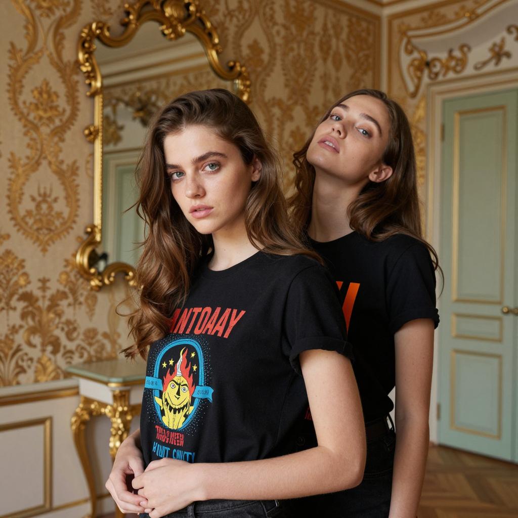 Two women with long brown hair in an ornate room. One woman wears a black shirt with colorful print, arms around waist, looking at camera. Other woman in black shirt with orange stripes, head tilted back, looking up. Gold patterned wallpaper, large mirror with ornate frame, wooden parquet floor, green door in background. Women's faces have intense expressions. Both have fair skin. Woman in colorful shirt is in front, woman in black shirt is behind. Both have slender builds.