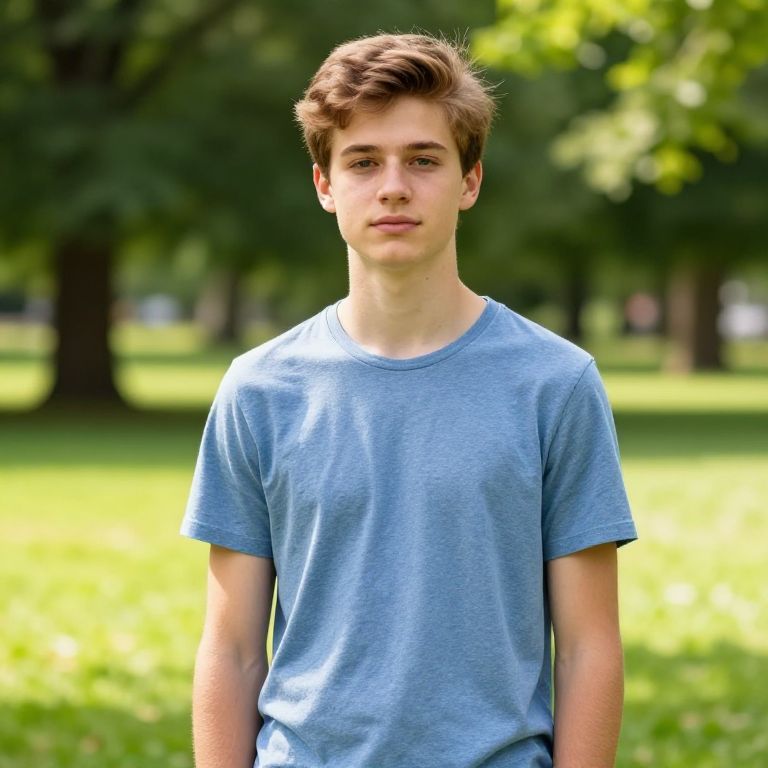 Photograph of a young man with short brown hair, wearing a light blue button-up shirt and black pants, standing in front of a green potted