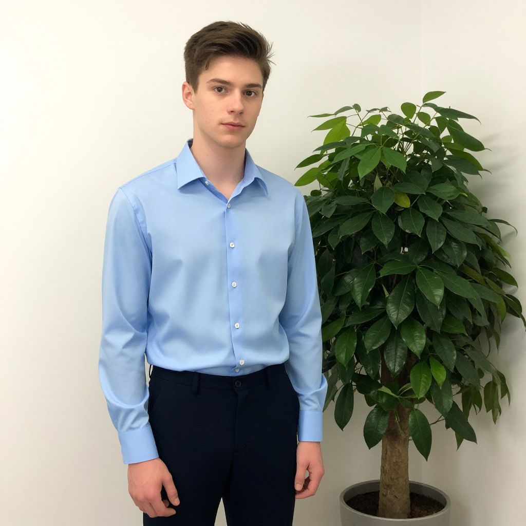 Photograph of a young Caucasian man with short, dark brown hair and fair skin, standing against a plain white background. He is wearing a light blue, long-sleeved dress shirt with the top button undone and black dress pants. His expression is neutral, with slightly parted lips and a direct gaze at the camera. To his right, there is a tall, green potted plant with lush leaves. The plant is in a brown pot, positioned near the bottom right corner of the image. The lighting is bright and even, highlighting the man's clothing and the plant's texture.