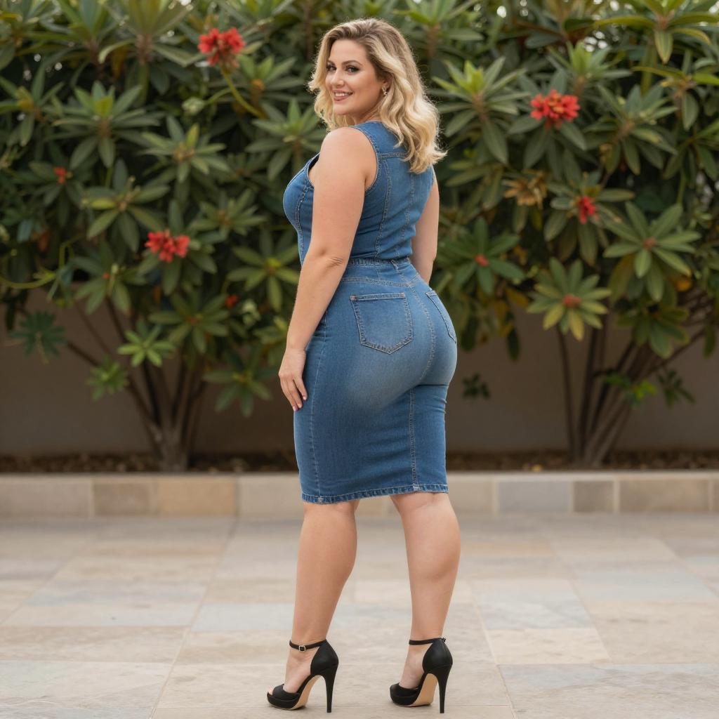 Photograph of a curvy woman with blonde hair in a tight, blue denim dress, highlighting her hourglass figure and prominent buttocks. She stands in a tiled outdoor area, looking over her shoulder with a confident smile. She wears black high-heeled shoes and is surrounded by lush green plants with red flowers.