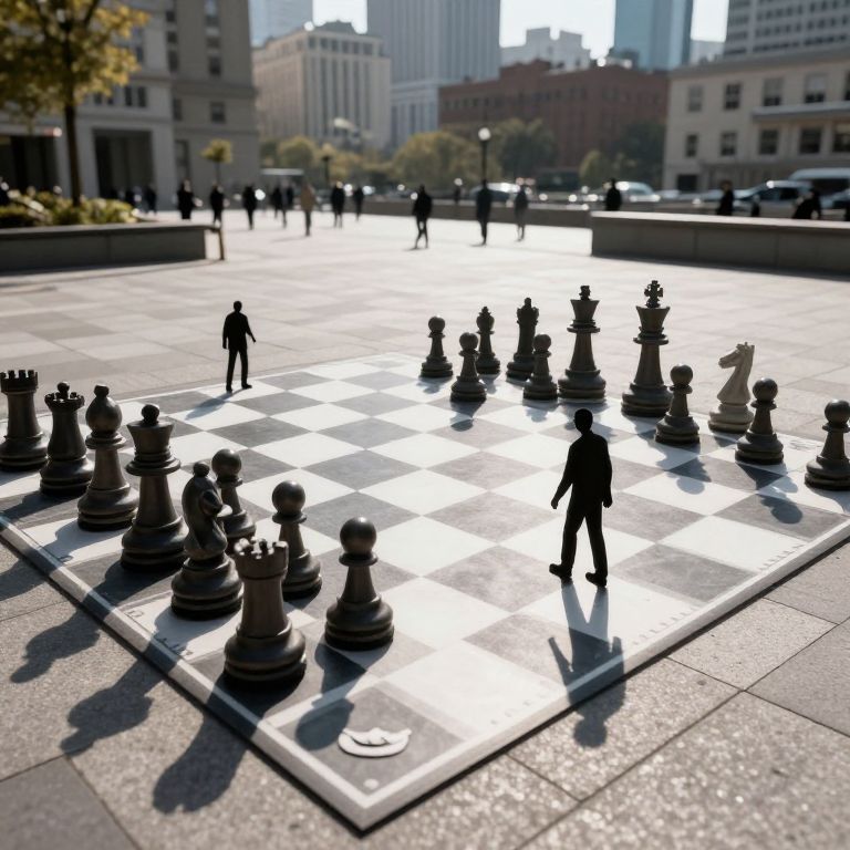 A colossal chessboard unfolds across a city square, where pawns are citizens and the game is played by shadowy humanoid figures whose strategic moves reshape real-time architecture.