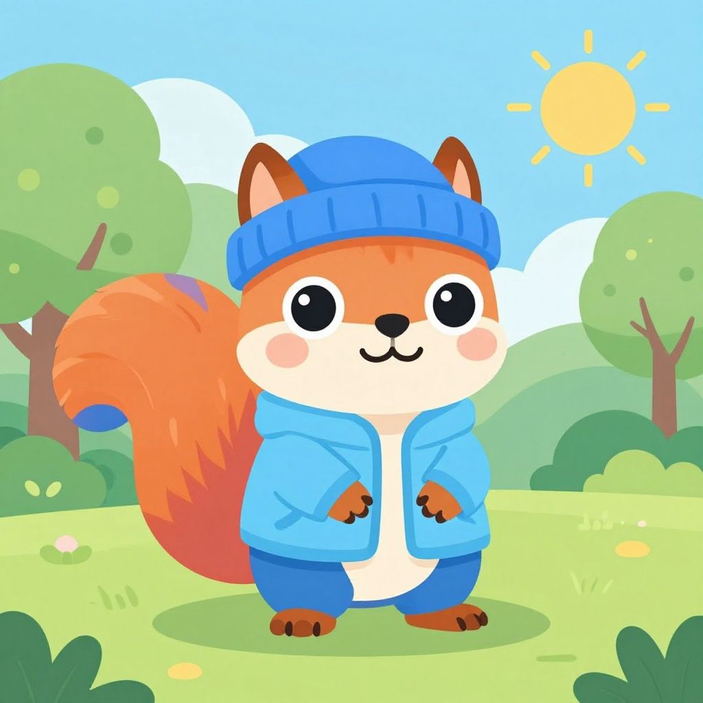 A 2D flat vector illustration of a cute and cheerful squirrel wearing a light blue jacket and leggings, sitting in a sunny park setting. The squirrel has big expressive eyes, a colorful bushy tail with orange and blue gradient shades, and a matching blue beanie with ear holes. The background consists of stylized green trees, a clear blue sky, and a bright sun, creating a vibrant and relaxed atmosphere.