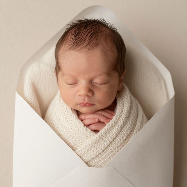 Photograph of sleeping newborn baby with closed eyes, wrapped in a white knitted blanket inside a white paper envelope. Soft lighting.