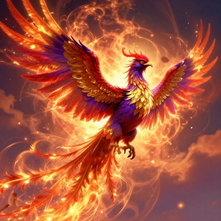 A mesmerizing digital illustration showcases an awe-inspiring mythical phoenix, reminiscent of fantastical artwork, emerging gracefully from a burst of vivid flames that cascade in colors reminiscent of an autumn sunset. The phoenix's resplendent wings are spread wide as it prepares to soar, its iridescent feathers shimmering with rich purples, golds, and reds. Captured from a low-angle perspective, this captivating scene transports the viewer into the heart of nature's untamed power, evoking both hope and reverence for the majestic creature's emergence.