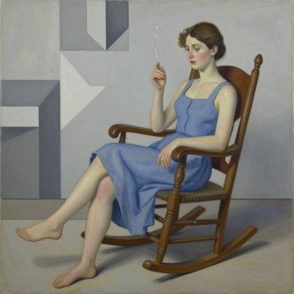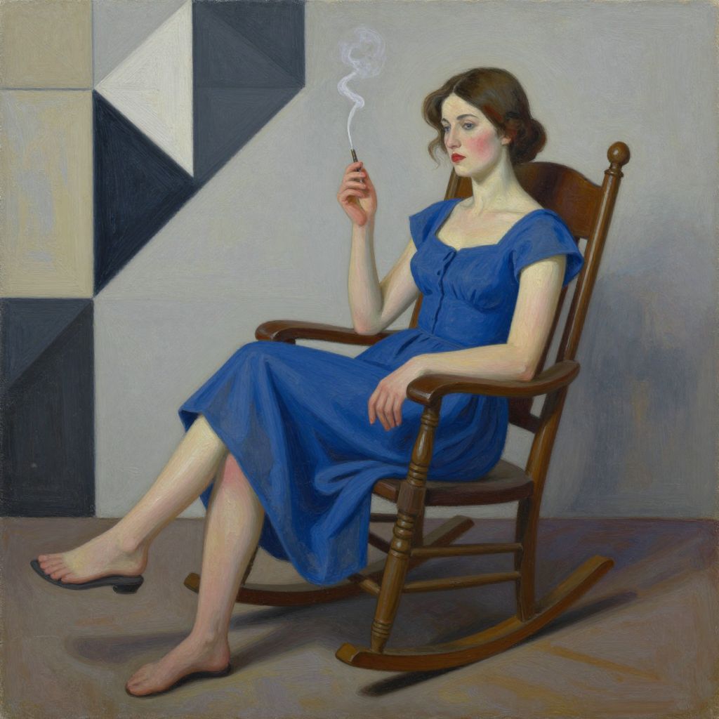 Realistic painting of a fair-skinned woman with short brown hair, wearing a blue dress, sitting barefoot on a wooden rocking chair, smoking a