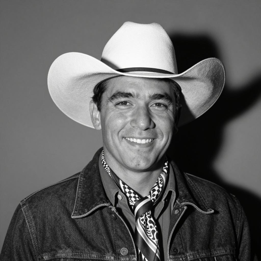 Black and white photo featuring two middle-aged Caucasian men in dark suits and patterned ties. The man in the foreground is smiling, wearing a large cowboy hat, showing head and upper torso. Behind him, a serious-looking man stands at a wooden podium with a microphone. A large American flag is displayed prominently in the background, suggesting a political or formal event setting.