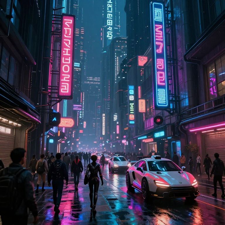Neon-lit cyberpunk street scene at night, with rain-slicked pavement, glowing signs, crowded pedestrians, and futuristic white sports cars,