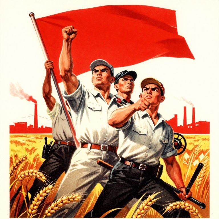 Communism-inspired propaganda poster design featuring strong, determined workers raising flags and tools, surrounded by fields of wheat and smokestacks, rendered in a vintage 1950s print style with stark reds and blacks, dynamic and powerful composition.