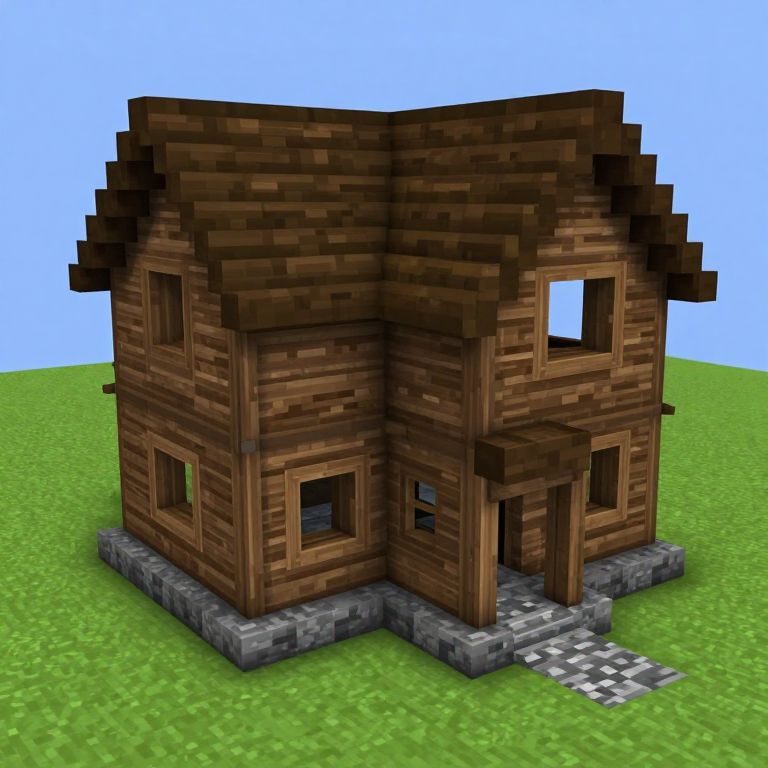 Step-by-step guide showcasing a dark oak wooden house built in Minecraft, featuring a sloped roof, chimney, multiple windows, and a stone-paved entrance pathway.