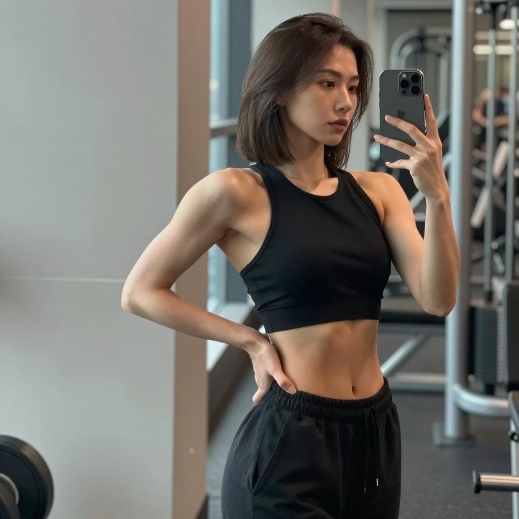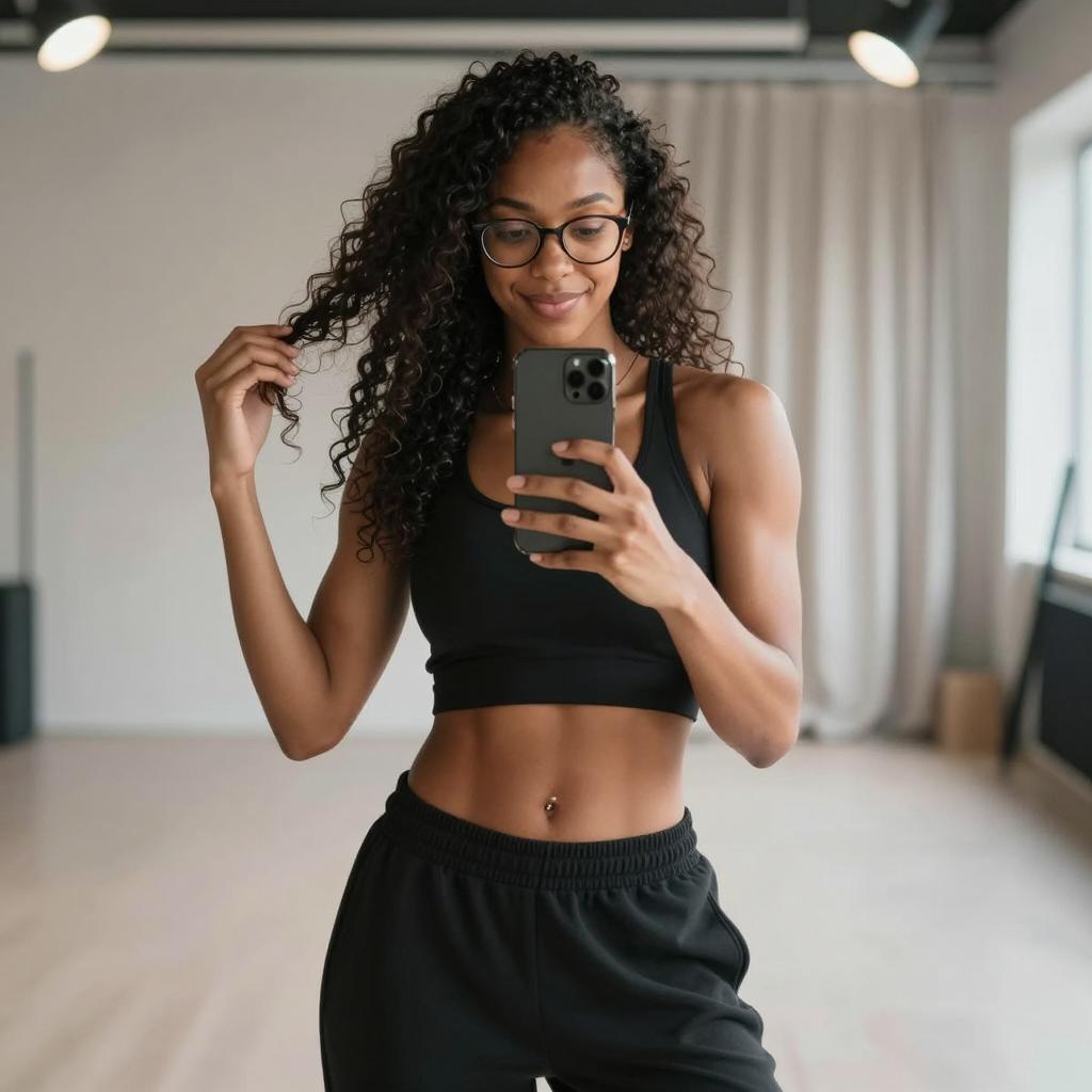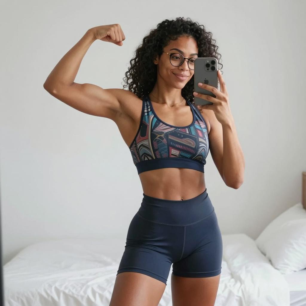 Wiry physique, selfie-style portrait of an athletic woman with tight waist and visible abs taking a photo in the mirror, brown-skinned woman with long braids cascading over one shoulder wearing bright patterned sports bra and simple black leggings posed standing straight on to the mirror with relaxed posture, phone partially covering her face in simple bedroom with white walls and a neatly made bed, modern fitness lifestyle photo, high resolution, ultra-detailed