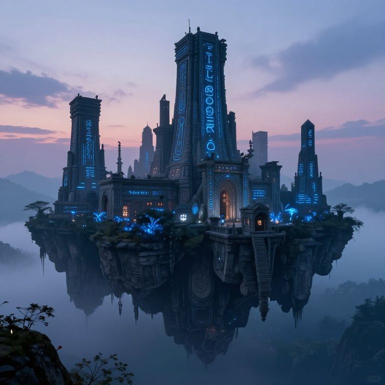 Ciloranko, a mysterious ancient city built on floating islands, with intricate stone architecture covered in glowing blue runes, misty atmosphere, and bioluminescent plants illuminating the twilight sky, fantasy art style.