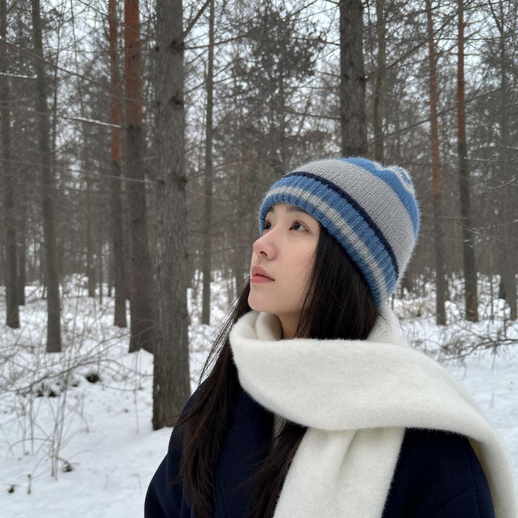 Photograph of an Asian girl with long black hair, wearing a blue winter coat, yellow gloves, and a blue-and-white striped knit hat. She is shielding her eyes with her right hand, looking ahead. A beige scarf is wrapped around her neck. The background features blurred, leafless trees in sunlight.