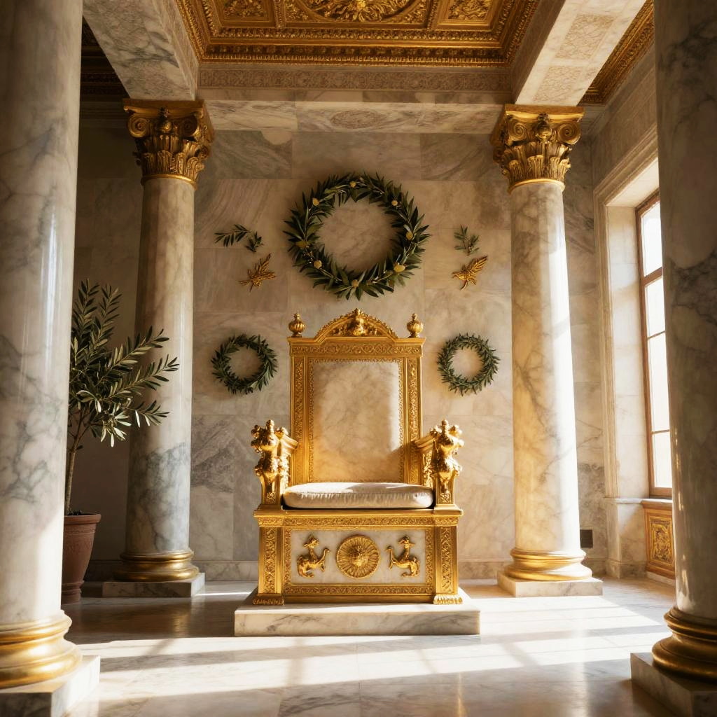 Ancient Greek throne room with grand marble columns, intricate gold decorations, olive wreaths adorning the walls, bathed in warm sunlight streaming through tall windows, majestic atmosphere