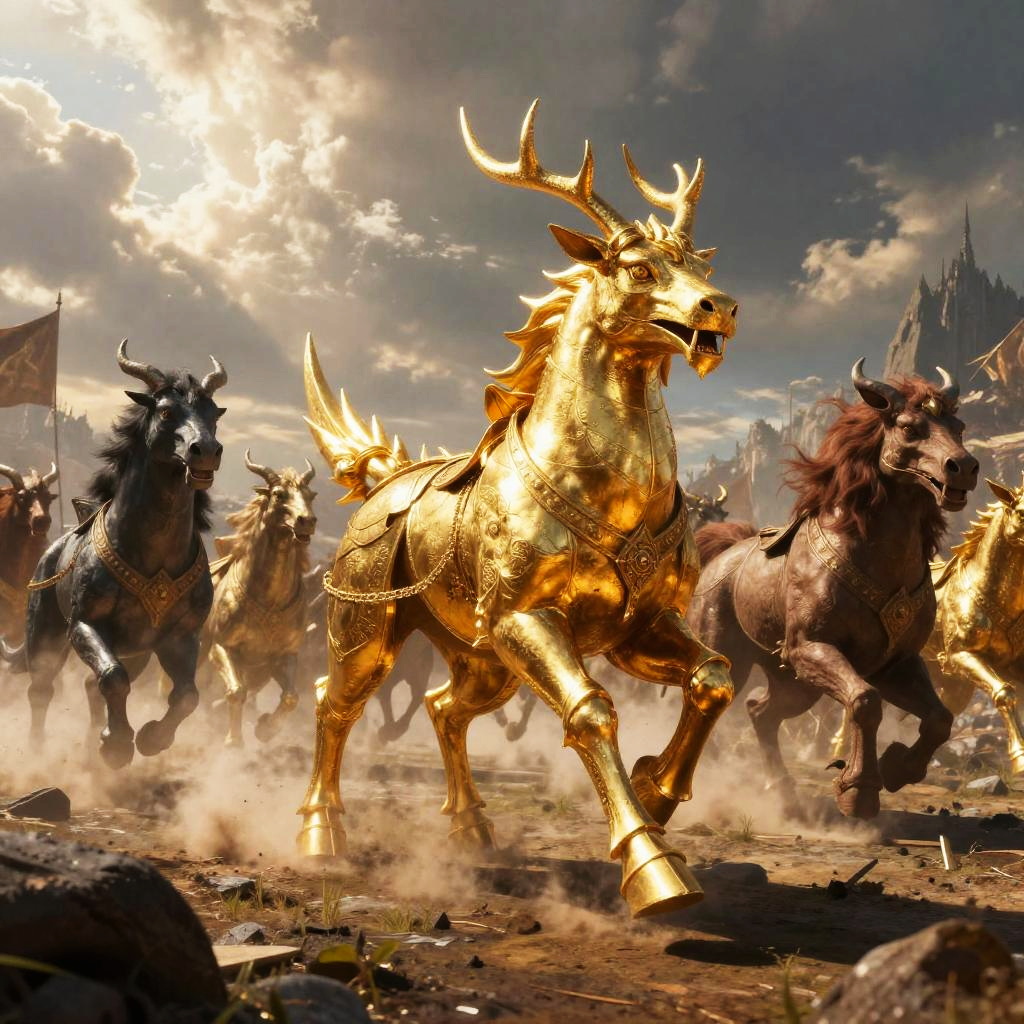 Epic fantasy battle scene with a goldingo leading a pack of mythical creatures across a battlefield, golden armor gleaming in the sunlight, dramatic clouds overhead, intense action and movement, richly textured environment