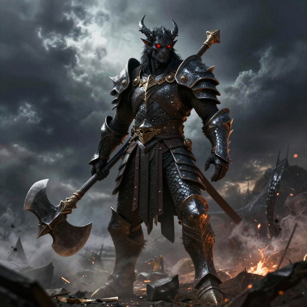 A battle-ready duergar paladin in detailed armor embossed with sacred dwarven motifs, holding a large glowing hammer and shield, amidst an underground battlefield with shadows of enemies approaching, powerful and stoic stance, high-fantasy digital painting.