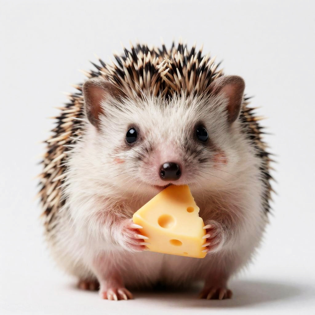 Upper body, solo, tiny hedgehog with soft brown spines, round rosy cheeks and delicate paws, holding cheese, looking at viewer, warm hazel eyes, closed mouth, straight-on, simple background