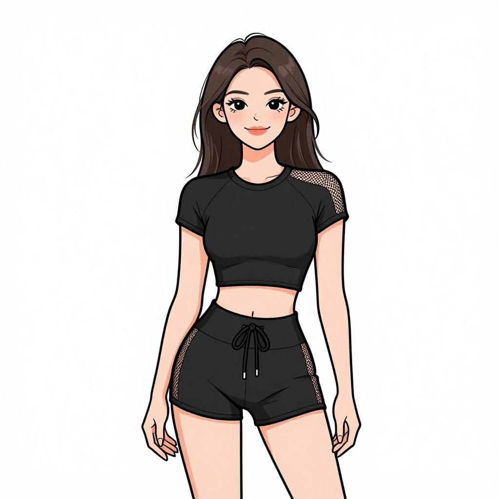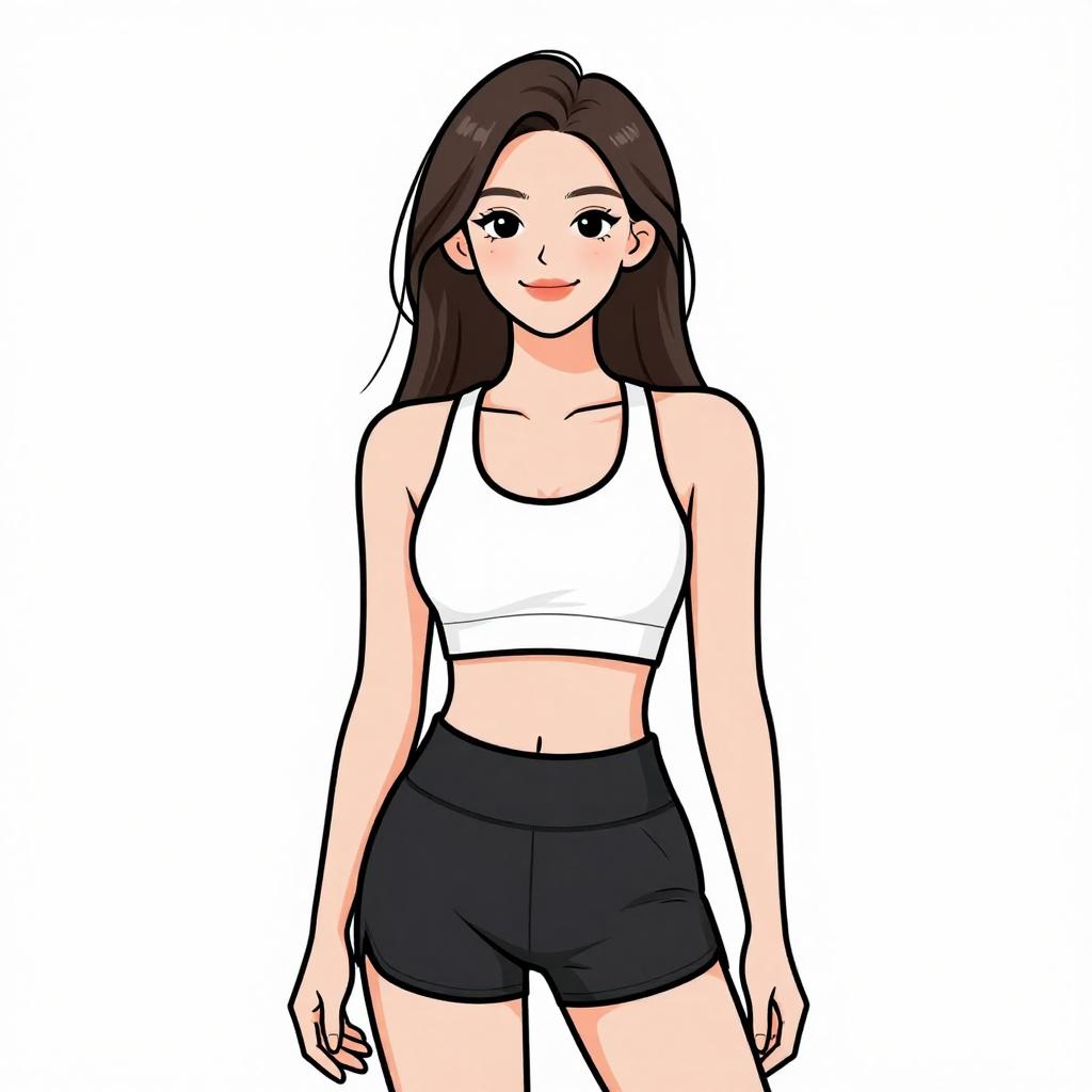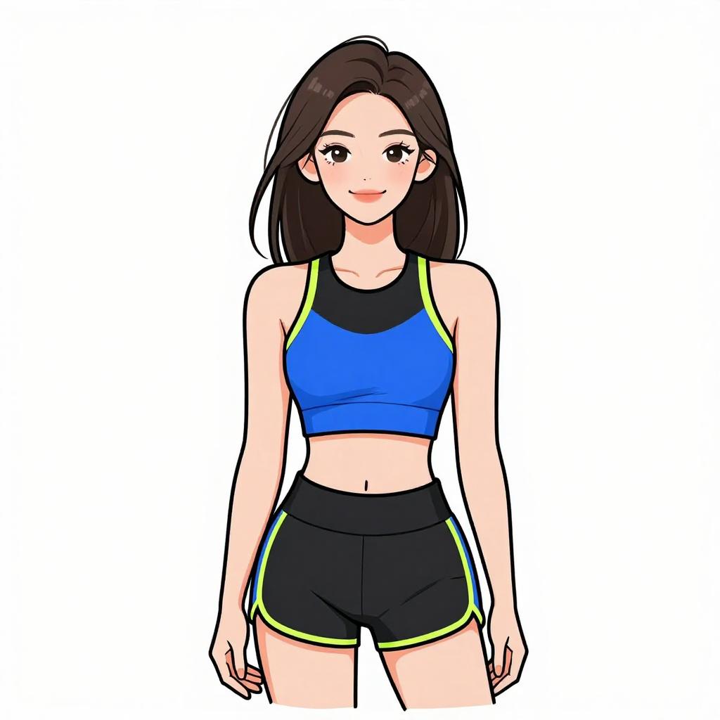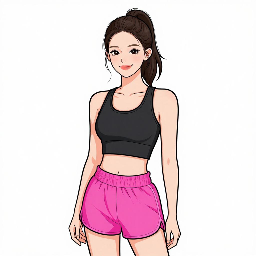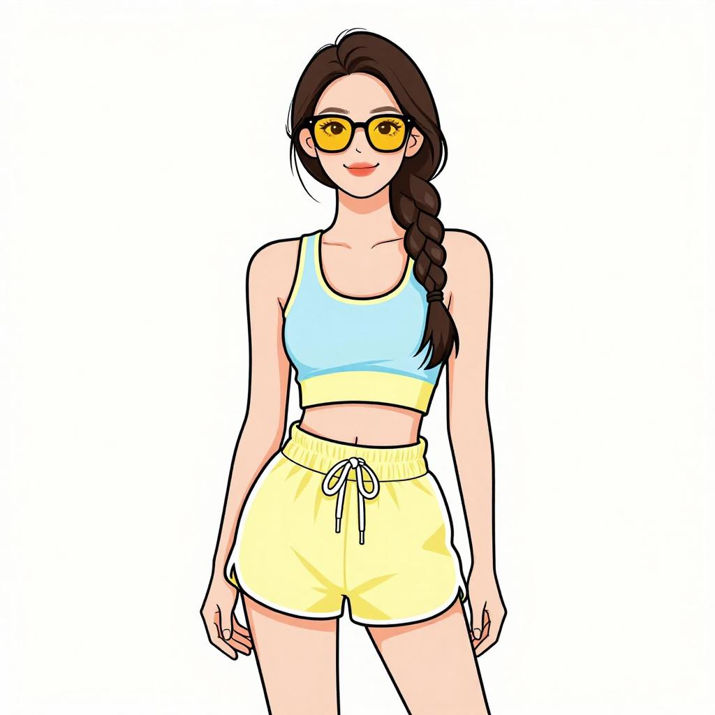 Woman with pretty face and pretty hair. smiling Woman, sporty casual, color-blocked crop top in pastel shades, scoop neck, racerback design, coordinating high-waisted shorts with drawstring waistband, pale yellow color, above-knee length, white stripe detail, lightweight fabric, oversized sunglasses with yellow tint, long braided hair, minimal jewelry, plain white studio background --sref 1467