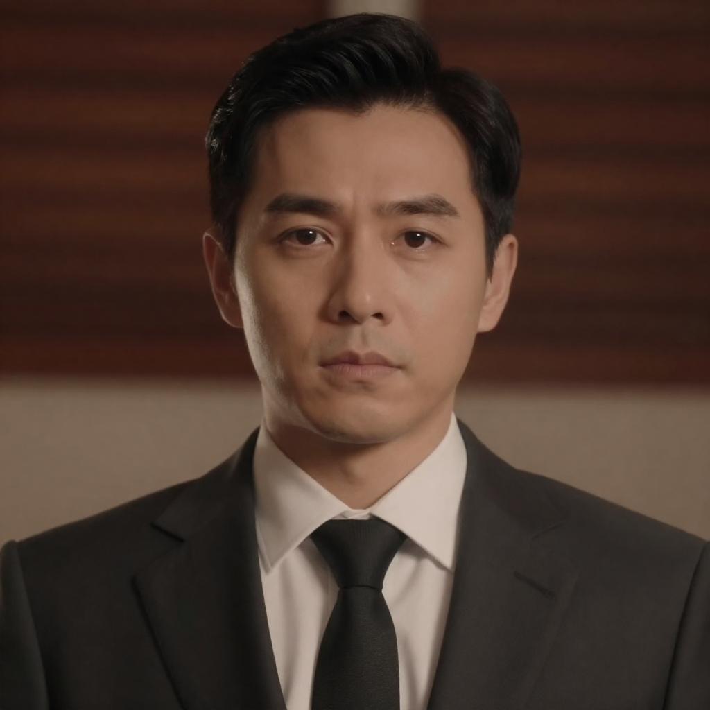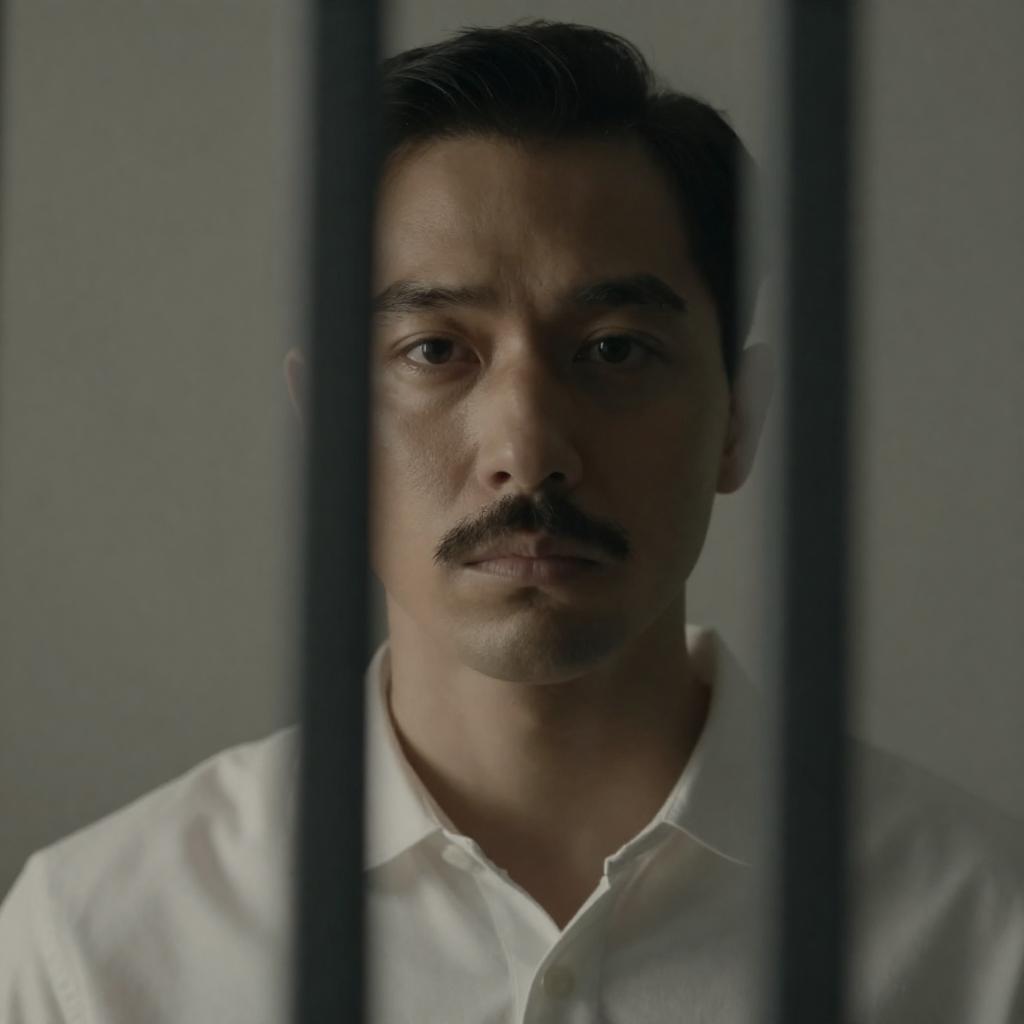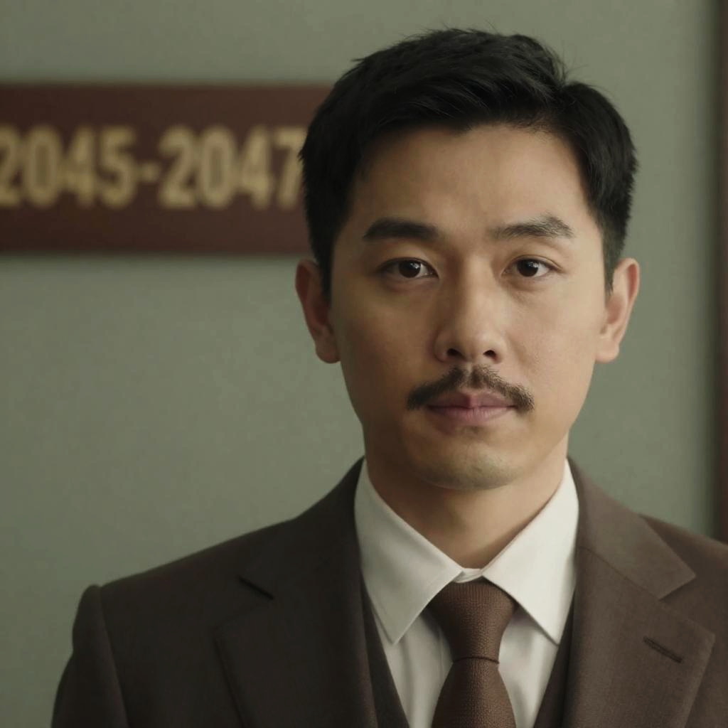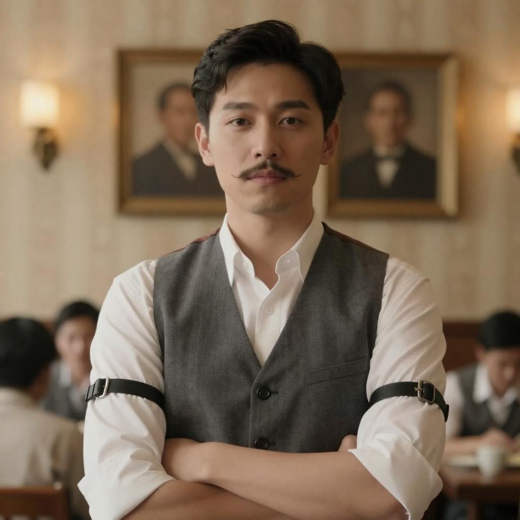 Portrait of an Asian man with a thin mustache wearing a grey vest over a white shirt with black leather armbands, standing with arms crossed. The background features patterned wallpaper, two framed vintage portraits, wall sconces with warm lighting, and blurred figures seated at tables, suggesting a vintage or historical setting.