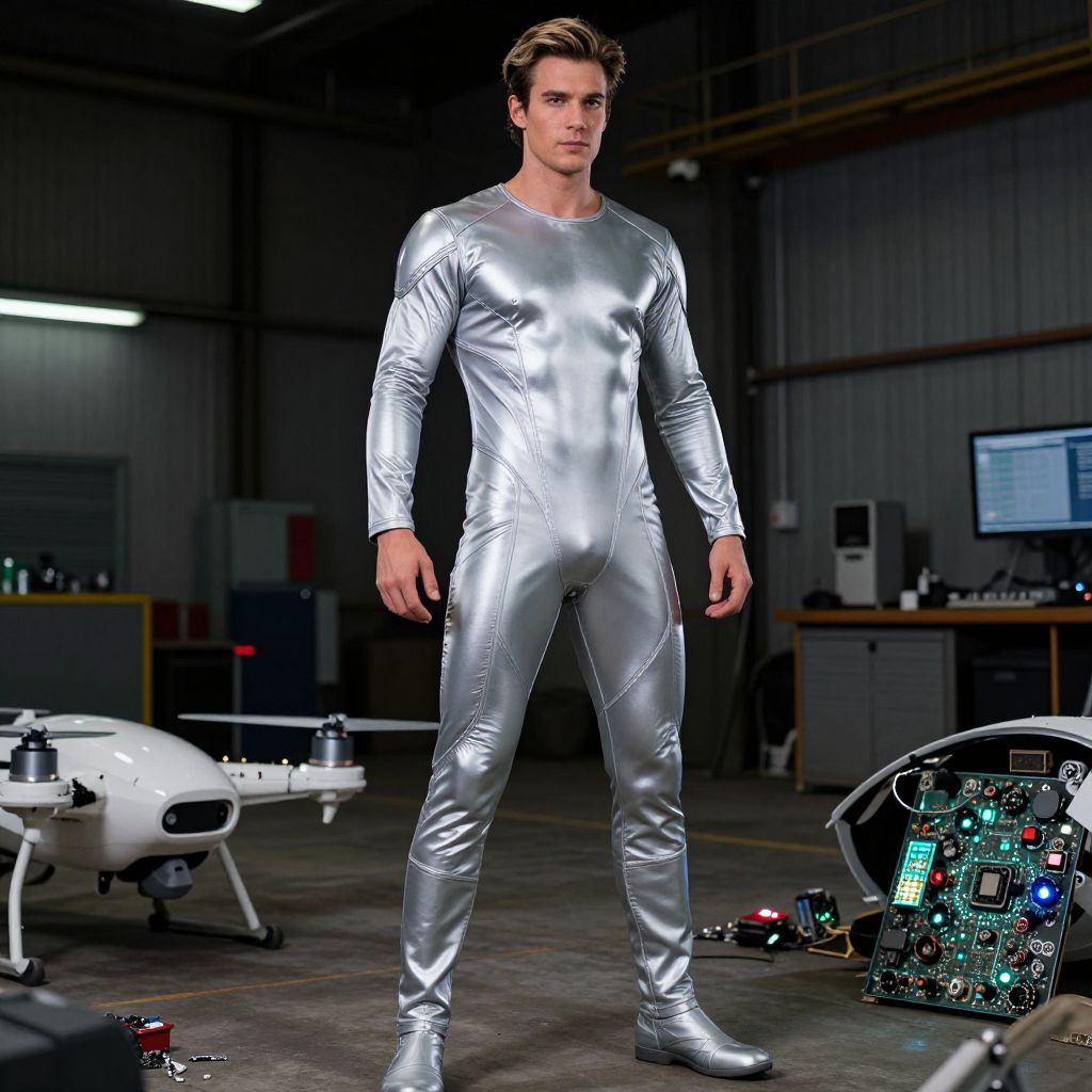 Photograph of a young, attractive white man with short brown hair standing in a dimly lit industrial workshop. He wears a tight, shiny silver full-body suit with long sleeves and boots, highlighting his athletic build. Behind him, there's a white drone on the left and a complex electronic circuit board on the right. The background includes metal walls, a computer monitor, and various electronic equipment. The overall scene has a futuristic, tech-savvy vibe. The man's confident stance and the metallic texture of his outfit contrast with the rugged, utilitarian setting.