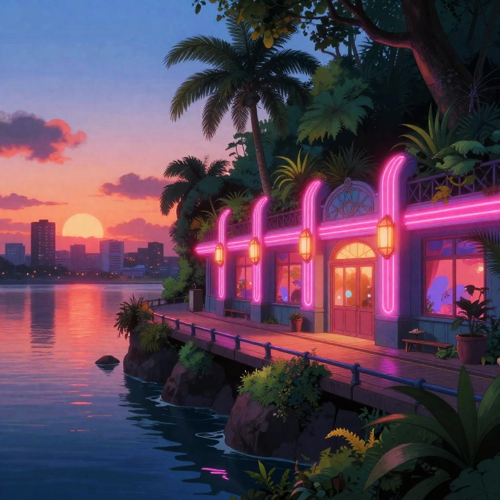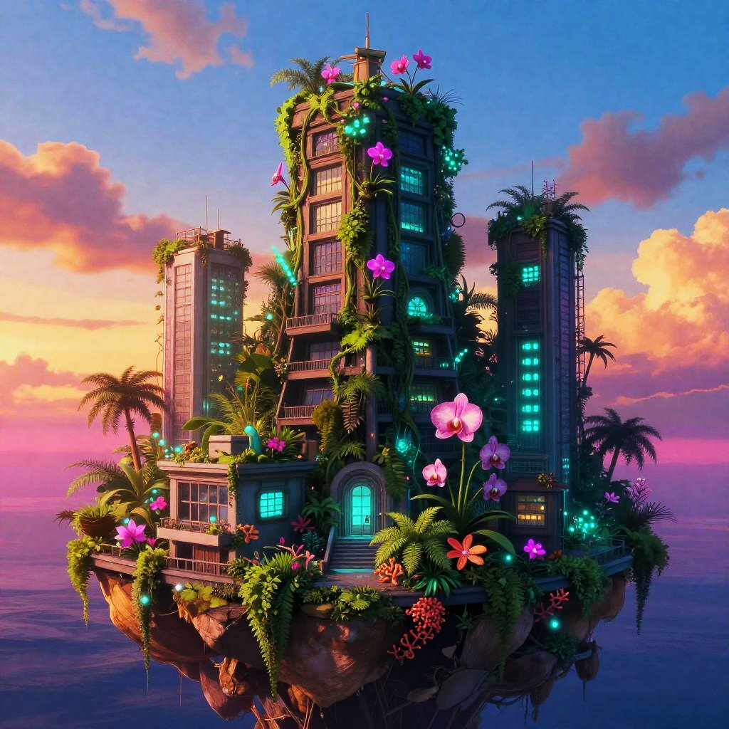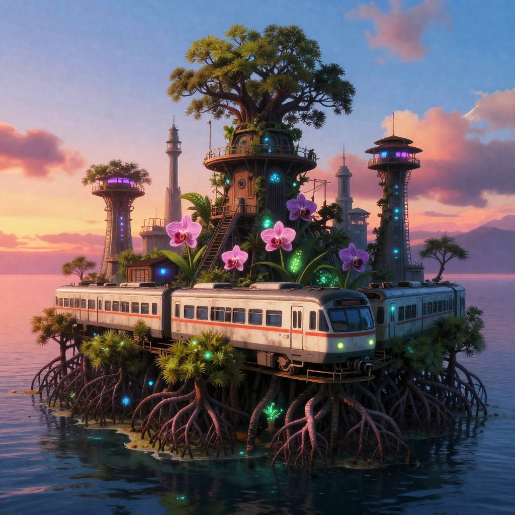 A luminescent reclaimed transit hub inspired by the works of Syd Mead, located on a fog-veiled ethereal island where bioluminescent mangroves, moss and orchids infiltrate rails and magnetic monorails. This scene captures a twilight glow filled with neon teal, molten amber, ultraviolet violet, perfect for trending on art platforms like ArtStation.
