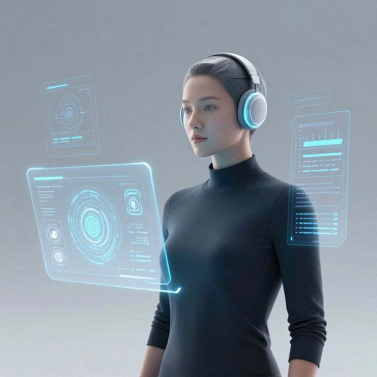 AI image portraying a virtual assistant avatar in holographic form, with a sleek interface floating around it, displaying data panels and futuristic icons, set against a high-tech digital backdrop with a minimalist style and cool tones.