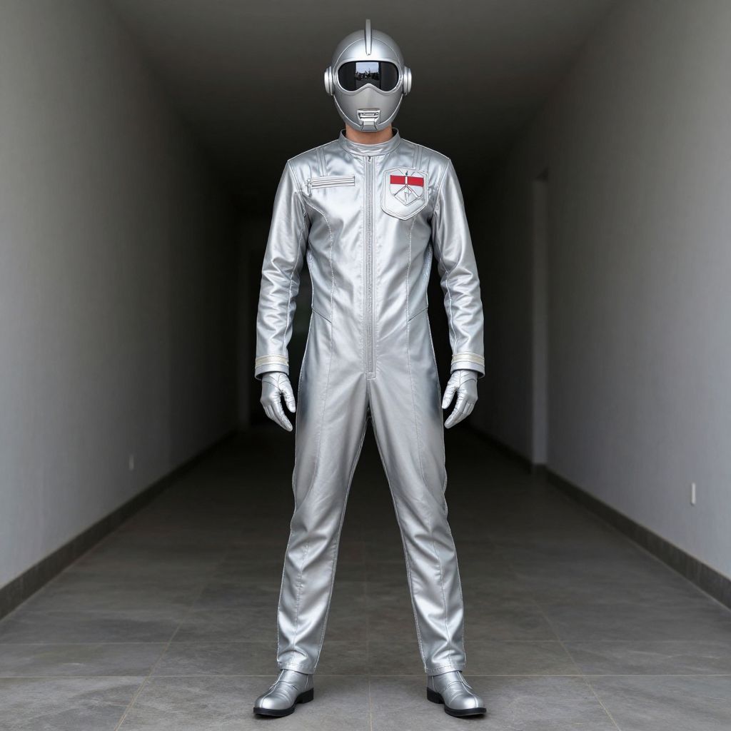 Photograph of a person standing in a dimly lit, narrow hallway. They are wearing a shiny, metallic silver jumpsuit with long sleeves and pants, and a matching silver helmet with black visor. The jumpsuit has a red and white emblem on the left chest. They also wear silver gloves and black boots. The hallway has white walls and gray tiled flooring, with the background fading into darkness. The person stands in a frontal pose, arms relaxed at their sides. The overall appearance is futuristic and somewhat mysterious.
